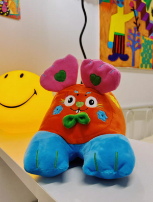 The relaxed bunny form and plush texture create a comforting, homey atmosphere.